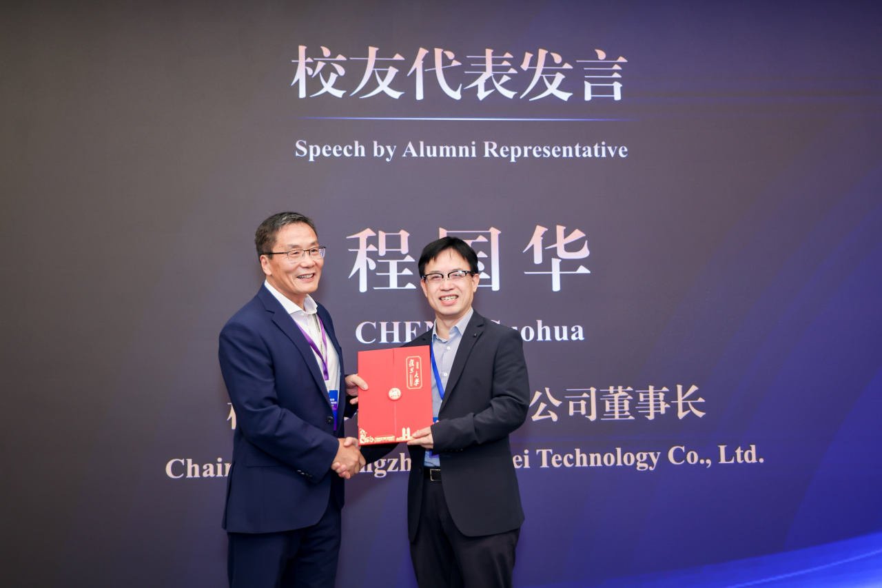 复旦大学类脑智能科学与技术研究院校友代表程国华在发言中讲述了其在光华楼萌芽的“用技术改变医疗”初心,在更广阔的舞台上长出具体模样。冯建峰为其颁发“类脑智能科学与技术研究院特殊贡献校友”纪念证书。