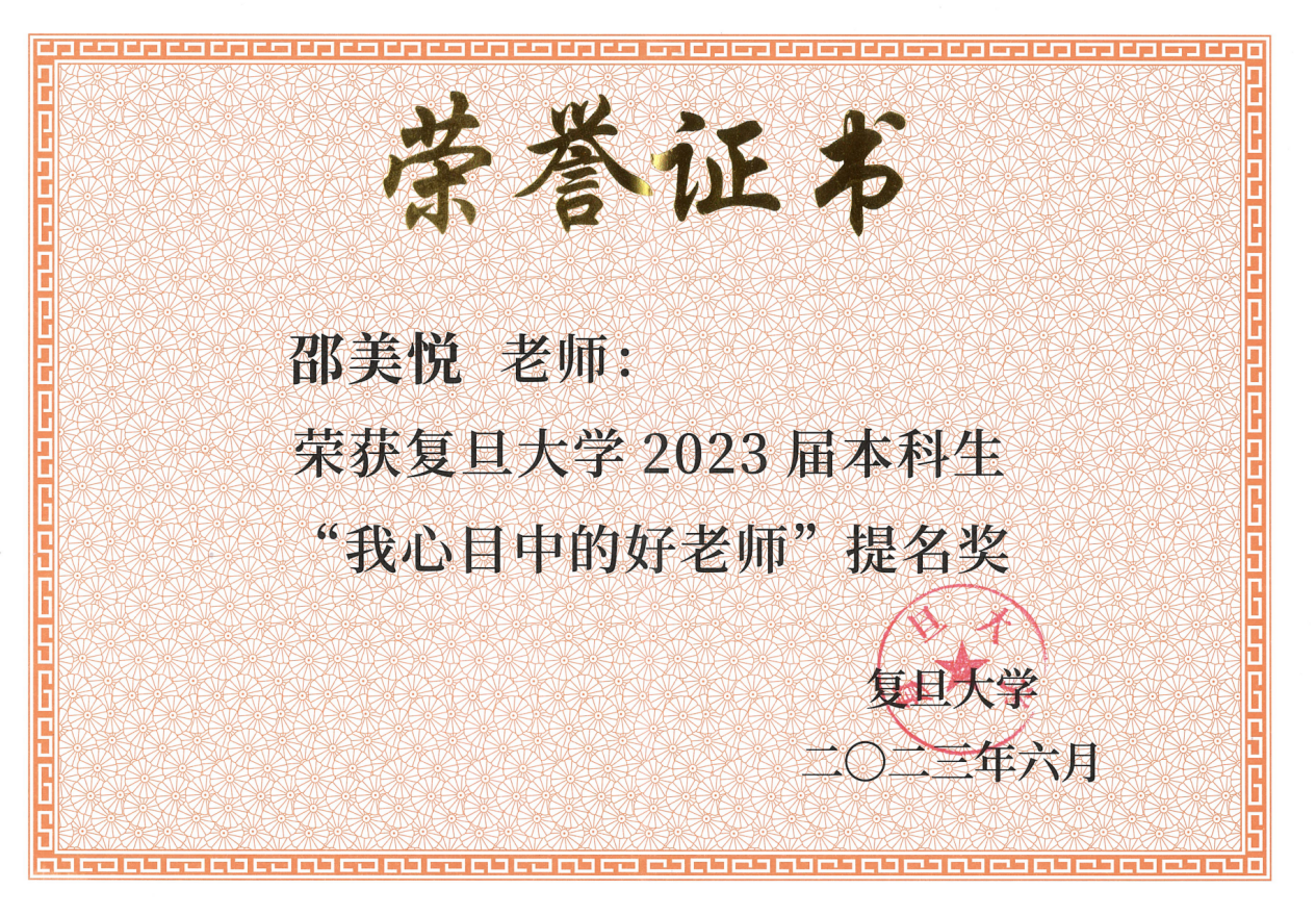 邵美悦老师荣获复旦大学2023届本科生“我心目中的好老师”提名奖