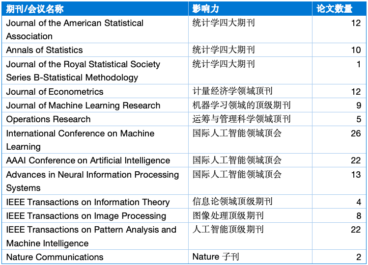 在统计理论与优化理论方面,青年学者在《Annals of Statistics》《Journal of the American Statistical Association》等统计顶刊发表23篇论文,在《Operations Research》等优化顶刊发表论文5篇。在人工智能与机器学习方向,学院在《IEEE TPAMI》发表论文22篇,在《JMLR》发表论文9篇,国际顶会(AAAI、NeurIPS、ICML)高水平论文超过60篇。